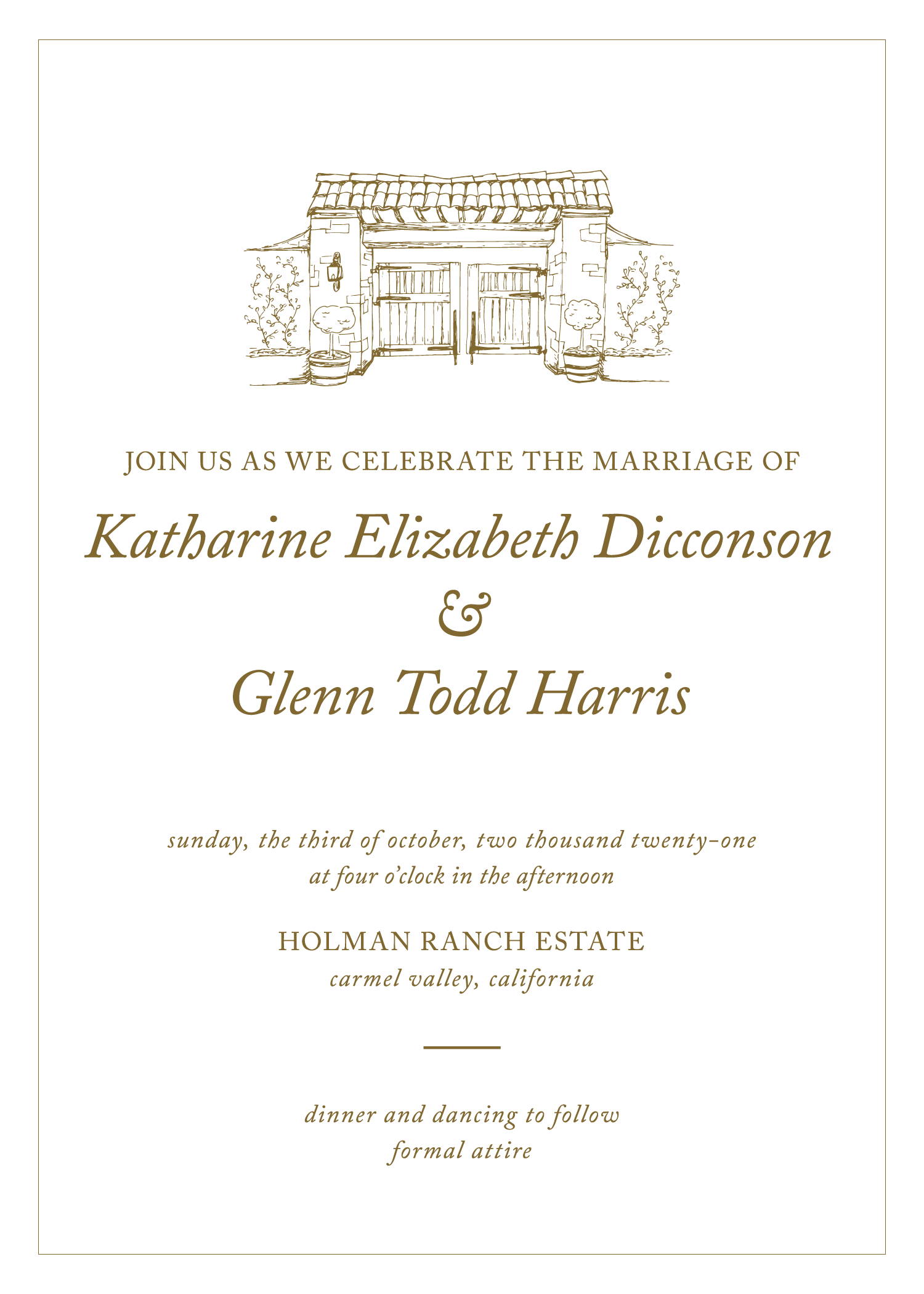 I designed all of the paper goods for our wedding, starting with the invitation suite pictured here, and had them printed with the help of the amazing Thea Sizemore of Kavamore Press. I hand-drew the gates and the crepe myrtle flower, which were both inspired by our wedding venue. We did a combination of digital printing, letterpress, and gold foil to bring my creations to life. The final invite was wrapped in velum, tied with gold string, and sealed with a custom wax seal.
